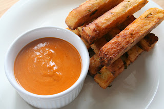 Cut into "fries" about 3 inches long. Heat about 1/2 inch of oil in a non-stick pan to 375F. If the oil isn't hot enough, the fries will soak up too much oil and fall apart. Cook until the fries are golden brown on all sides, about 2 minutes each on top and bottom sides. Remove and set on paper towels. Sprinkle with kosher salt to taste and serve with romesco sauce.Serves 4-6